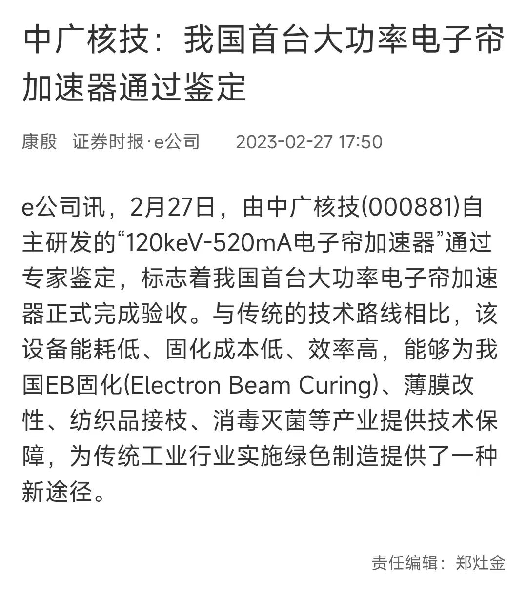2ÔÂ27ÈÕ£¬£¬£¬£¬£¬£¬£¬ÓÉÖÐ304ÓÀÀûµç×ÓºËÊÖÒÕÉú³¤¹É·ÝÓÐÏÞ¹«Ë¾£¨¹ÉƱ´úÂ룺000881.SZ£©ÍŽáÖпÆÔº½üÎïËùÑз¢µÄ¡°120keV-520mAµç×ÓÁ±¼ÓËÙÆ÷¡±Í¨¹ýר¼ÒÅжϡ£¡£¡£¡£¡£¡£±¾´ÎÅжϻáÓÉͬ·øÐÐҵлá×éÖ¯£¬£¬£¬£¬£¬£¬£¬Öйú¿ÆÑ§ÔºÔºÊ¿¡¢·ÅÉäҽѧÓë·øÉä·À»¤¹ú¼ÒÖØµãʵÑéÊÒÖ÷ÈβñÖ®·¼ÔºÊ¿µ£µ±ÅжÏר¼ÒίԱ»áÖ÷ÈΣ¬£¬£¬£¬£¬£¬£¬±ê¼Ç×ÅÎÒ¹úÊ×̨´ó¹¦Âʵç×ÓÁ±¼ÓËÙÆ÷ÕýʽÍê³ÉÑéÊÕ¡£¡£¡£¡£¡£¡£Óë¹Å°åµÄÊÖÒÕõè¾¶Ïà±È£¬£¬£¬£¬£¬£¬£¬¸Ã×°±¸Äܺĵ͡¢¹Ì»¯±¾Ç®µÍ¡¢Ð§Âʸߣ¬£¬£¬£¬£¬£¬£¬Äܹ»ÎªÎÒ¹úEB¹Ì»¯(Electron Beam Curing)¡¢±¡Ä¤¸ÄÐÔ¡¢·Ä֯Ʒ½ÓÖ¦¡¢Ïû¶¾Ãð¾úµÈ¹¤ÒµÌṩÊÖÒÕ°ü¹Ü£¬£¬£¬£¬£¬£¬£¬¾ßÓпɹ۵ľ¼Ã¼ÛÖµ¡¢Éç»áÐ§ÒæºÍÉúÌ¬Ð§Òæ¡£¡£¡£¡£¡£¡£ÓÈÆäÔÚÎÒ¹úÍÆ½ø¡°Ì¼´ï·å¡¢Ì¼Öк͡±µÄÕ½ÂÔÅä¾°Ï£¬£¬£¬£¬£¬£¬£¬Îª¹Å°å¹¤ÒµÐÐҵʵÑéÂÌɫ֯ÔìÌṩÁËÒ»ÖÖÐÂ;¾¶¡£¡£¡£¡£¡£¡£